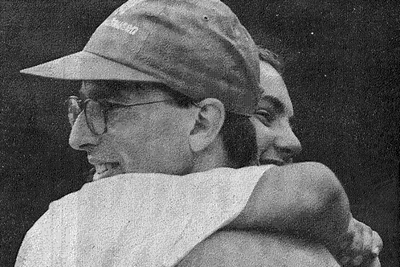 Herzogenaurach, 28.Juli 1996, Liebe geht nicht nur durch den Magen sondern macht auch schnelle Beine: Als Armin Jechnerer als Sieger des 11. Herzoman über die Ziellinie lief, gab es zur Belohnung ein Küßchen von seiner Freundin Ingrid Schneider, die kurz davor die Damenkonkurrenz des Kurztriathlons für sich entschieden hatte.
